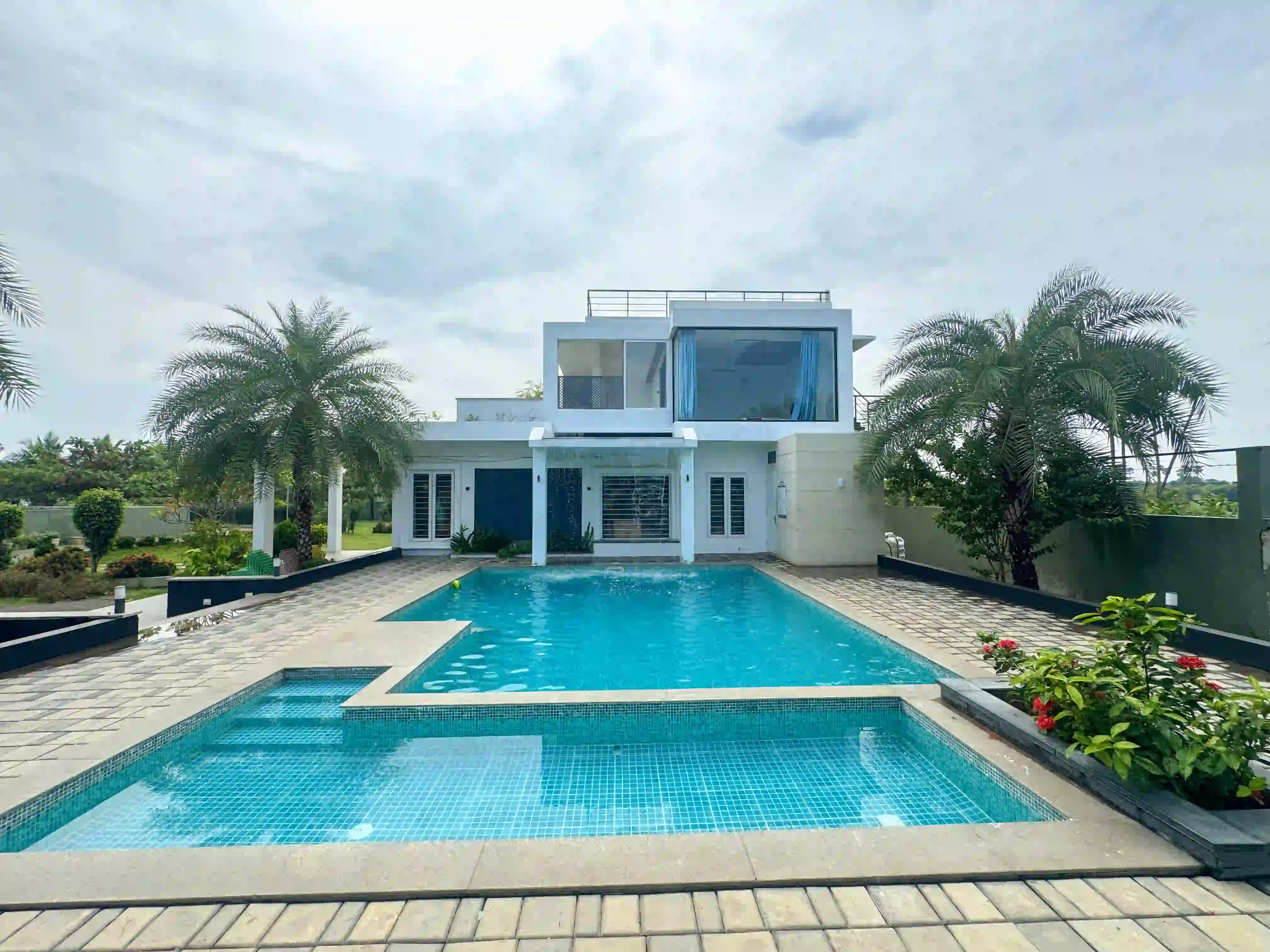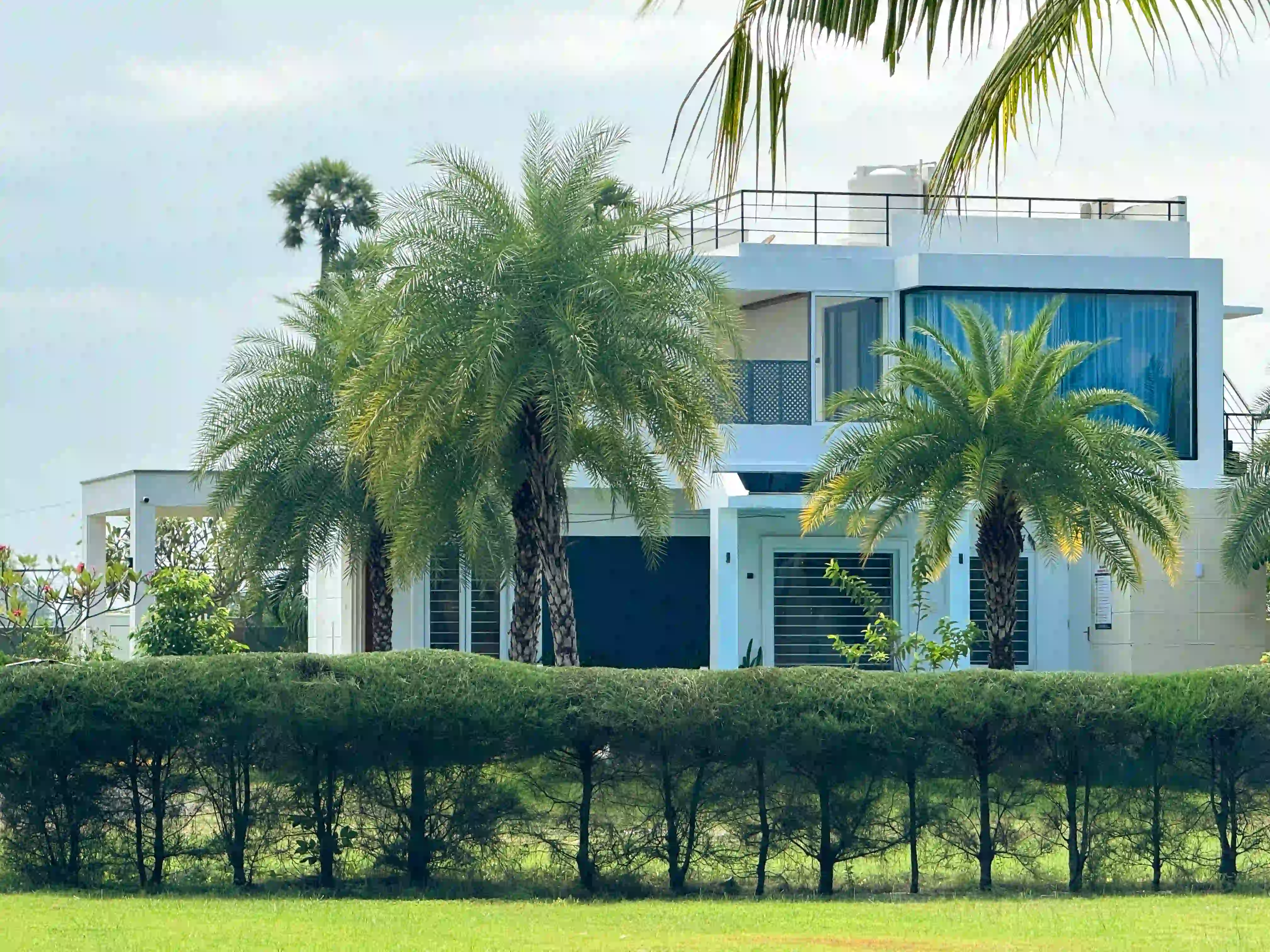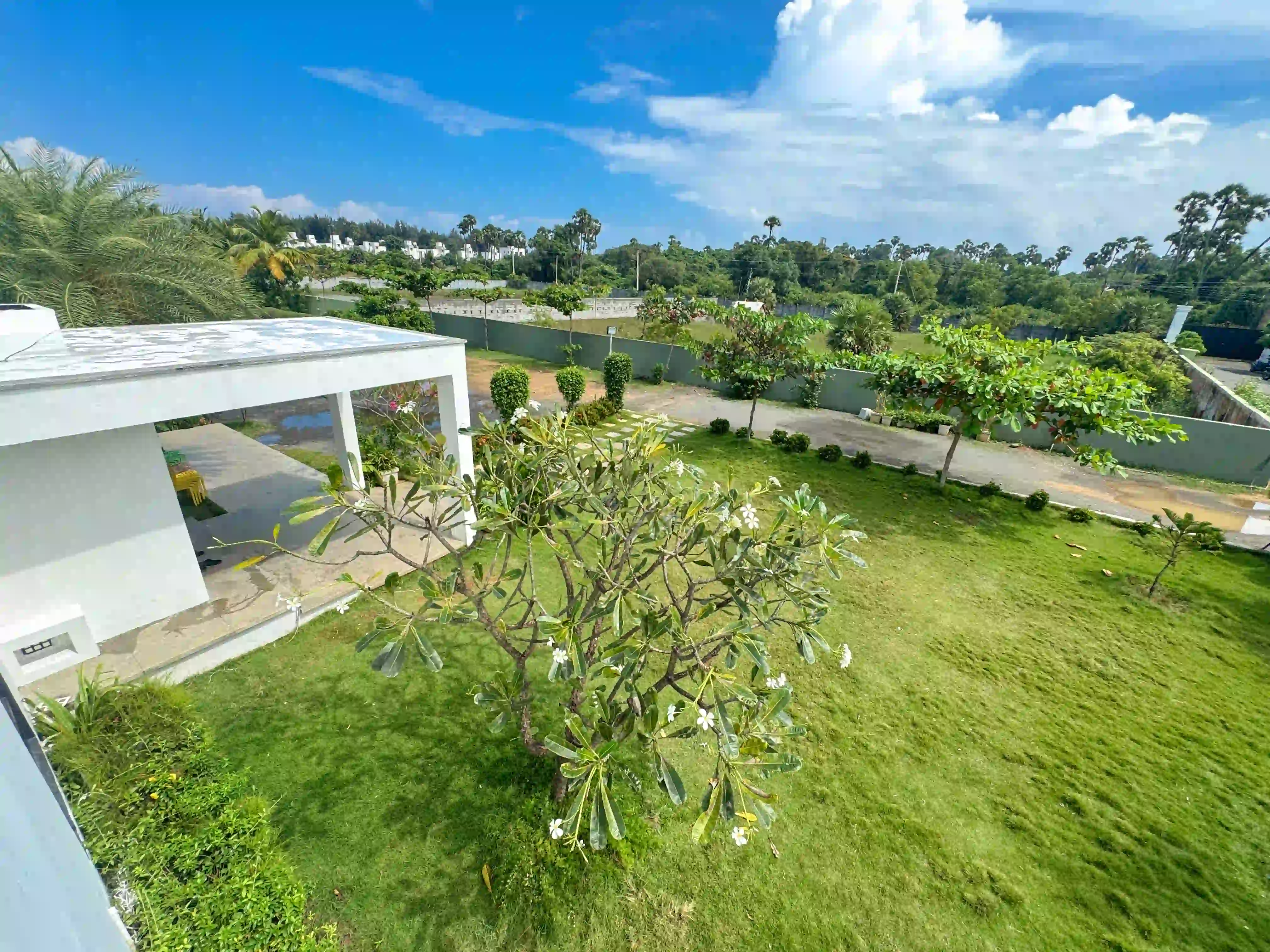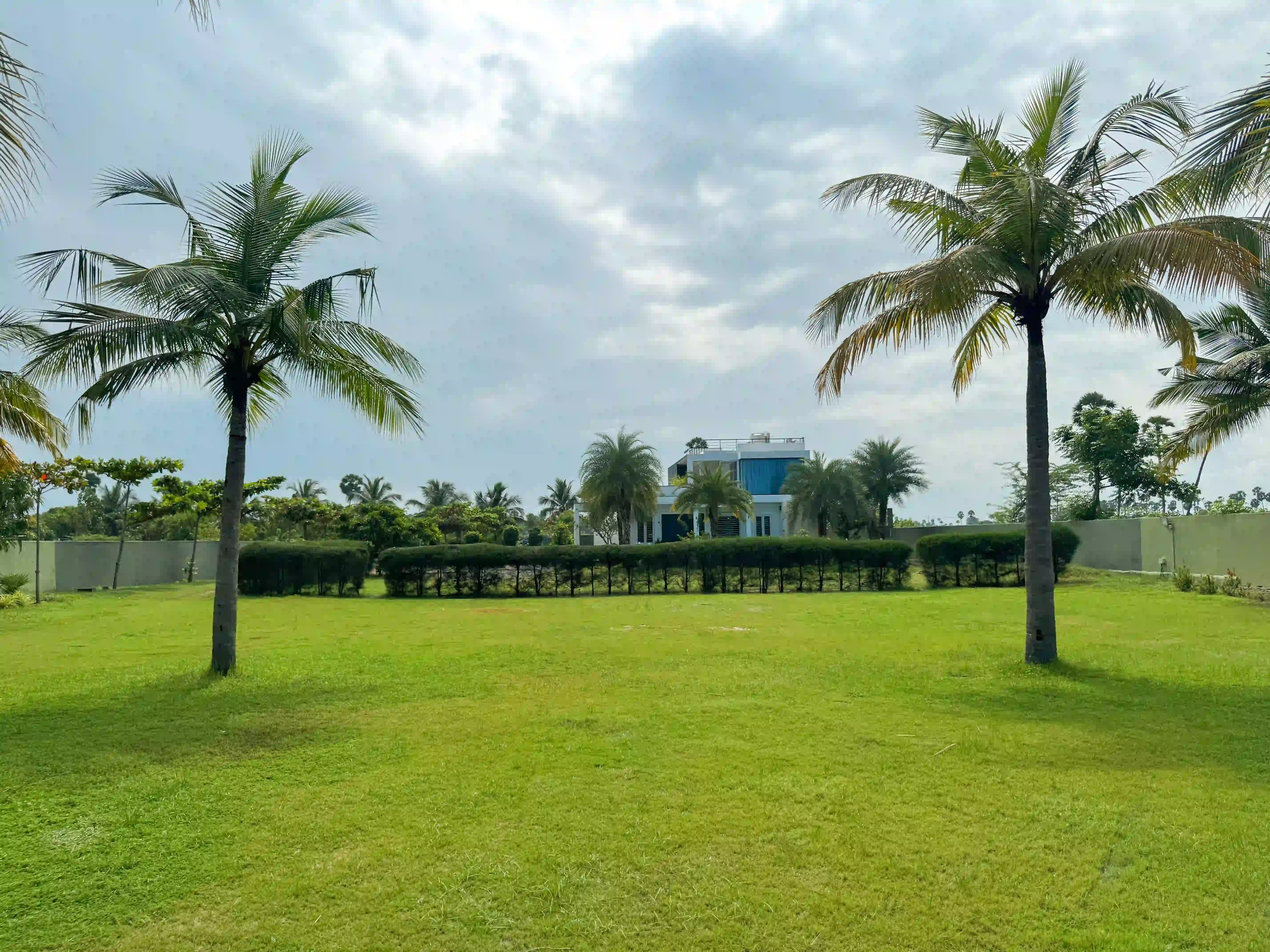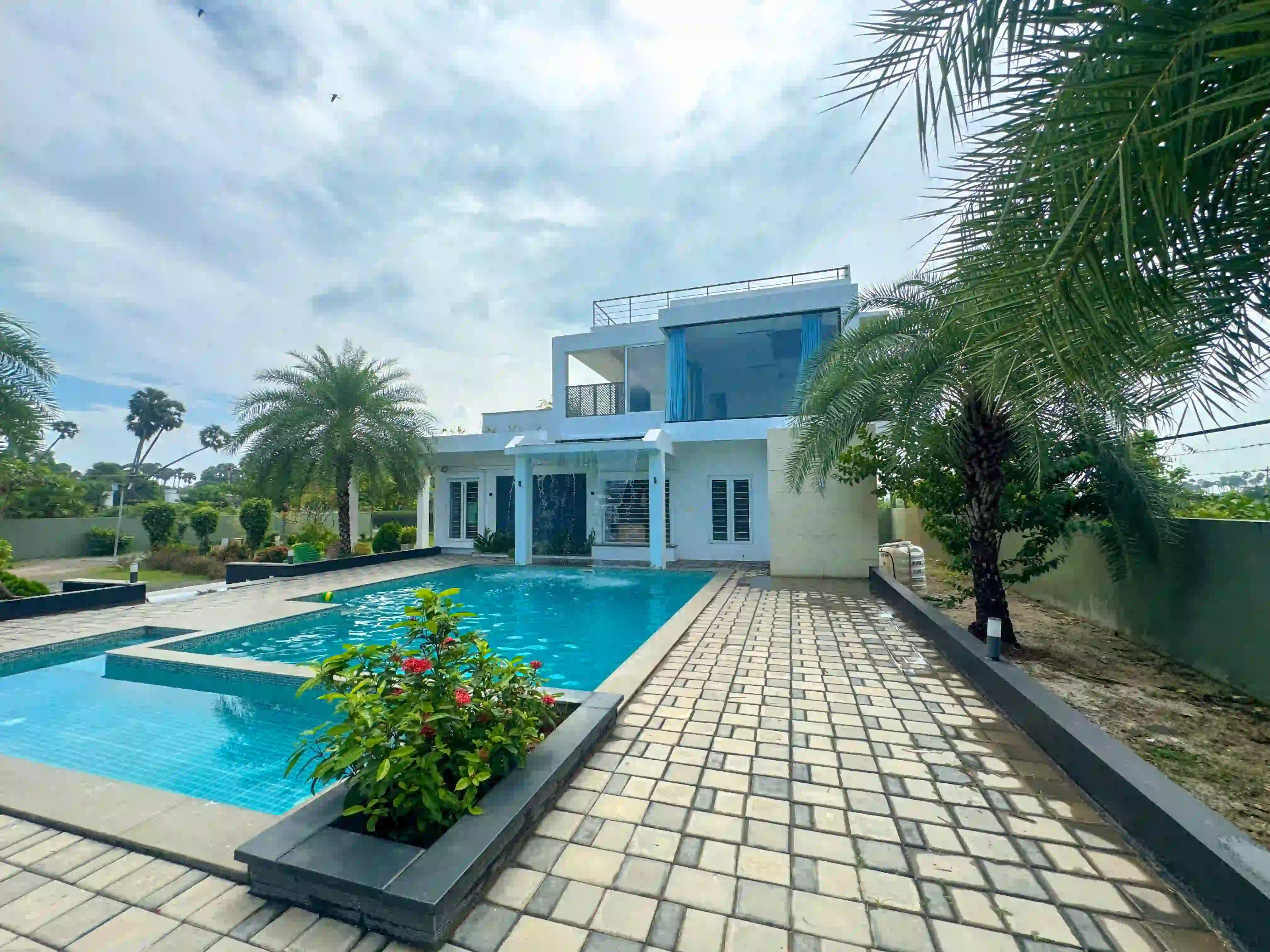 The Landmark Villa provides an exclusive space to go from the city lifestyle with privacy, comfort and sophisticated coastal living on the East Coast Road. Our one-acre 4BHK luxury beach villa blends the open green scenery with modern architectural design in Vadanemmeli, ECR. The smartly designed home with ground floor and first floor, with easy accessibility for the family and groups. Each Space promotes a tranquil living, with a vast lawn, ideal for intimate parties to large celebrations. Our modern interior design offers comfort and privacy. Our villa is surrounded by nature and a serene environment, which creates a balanced and sophisticated ambience. Whether it is a family retreat or a personal getaway, our villa provides privacy and style that integrates for memorable holidays.