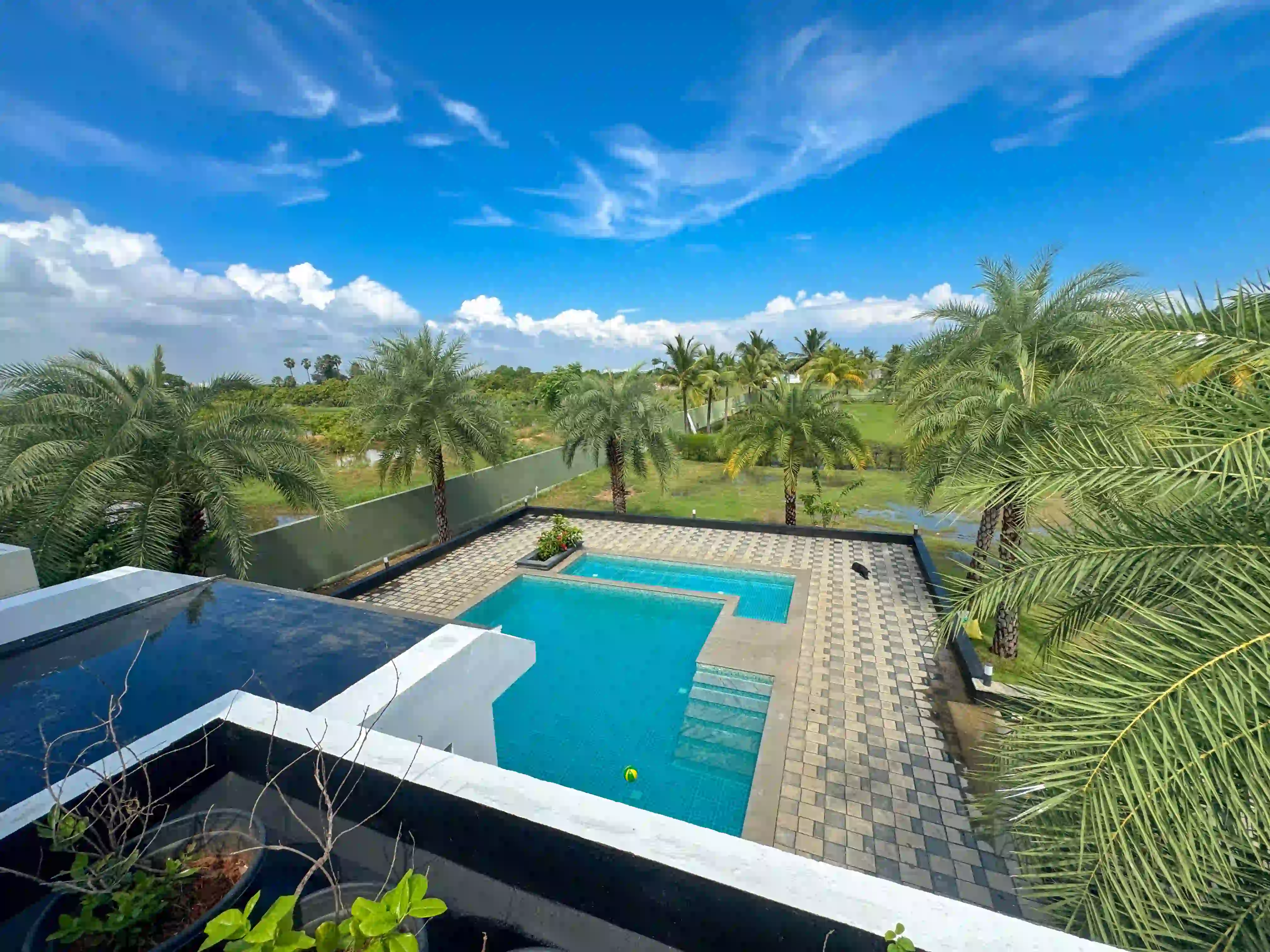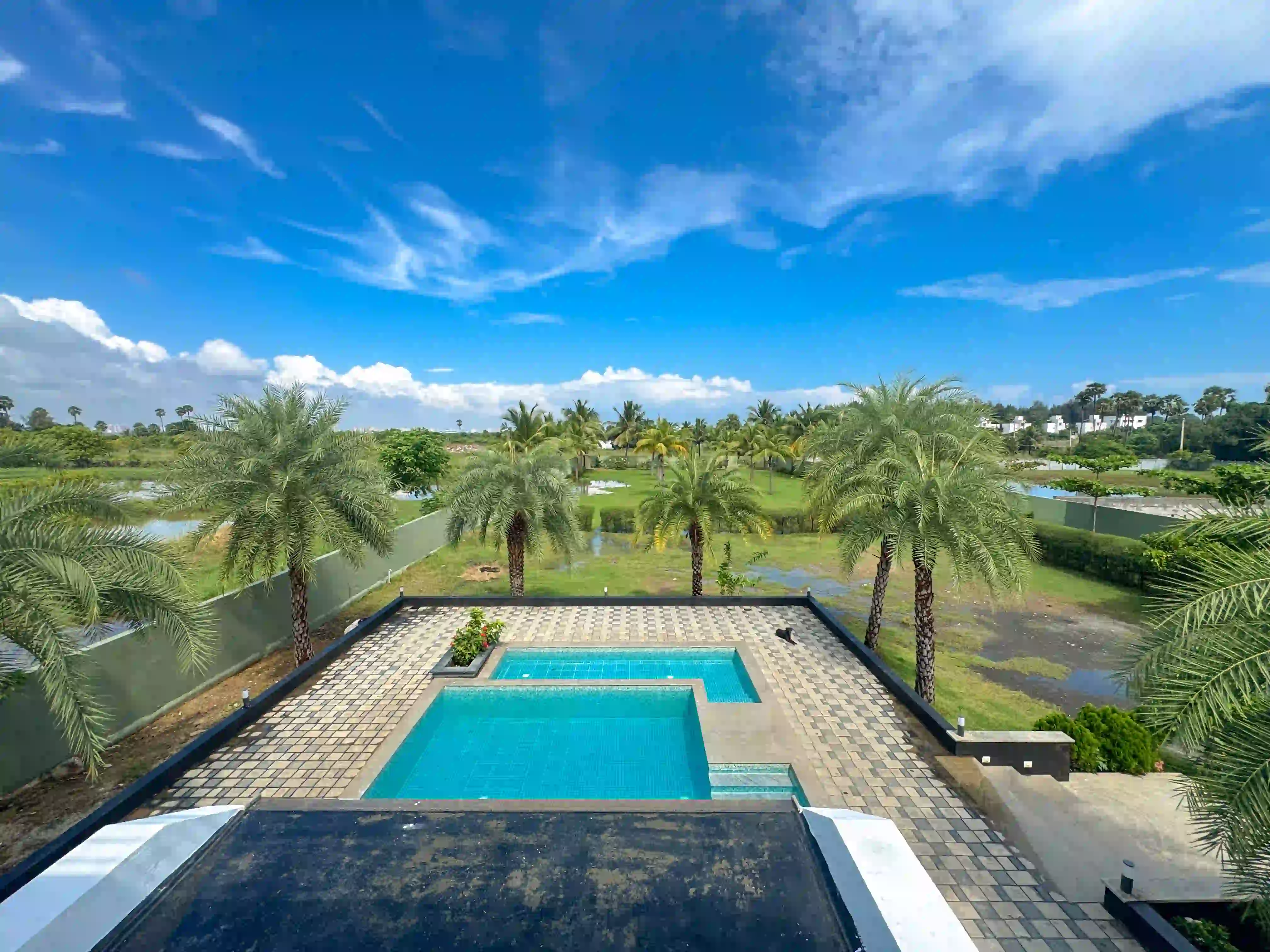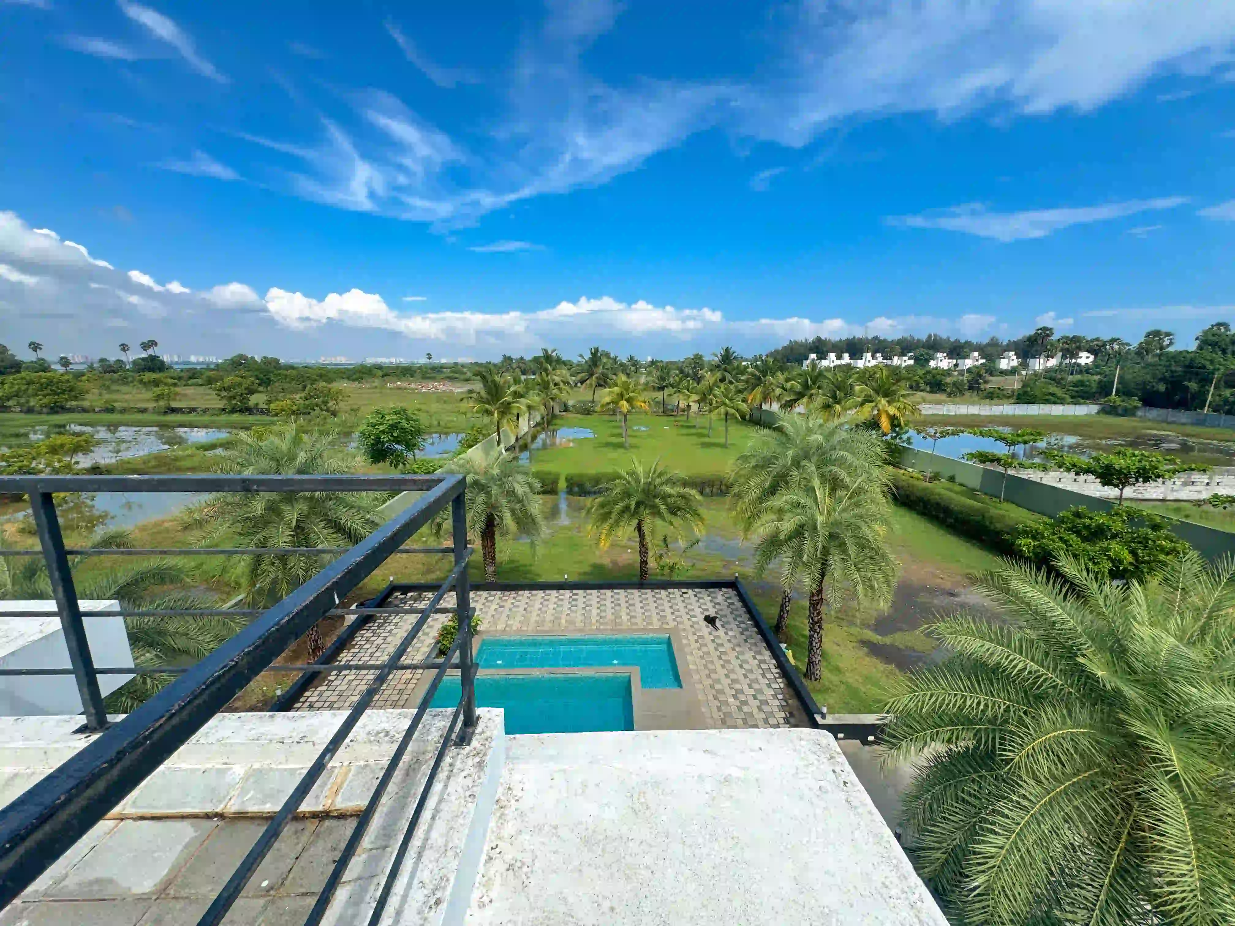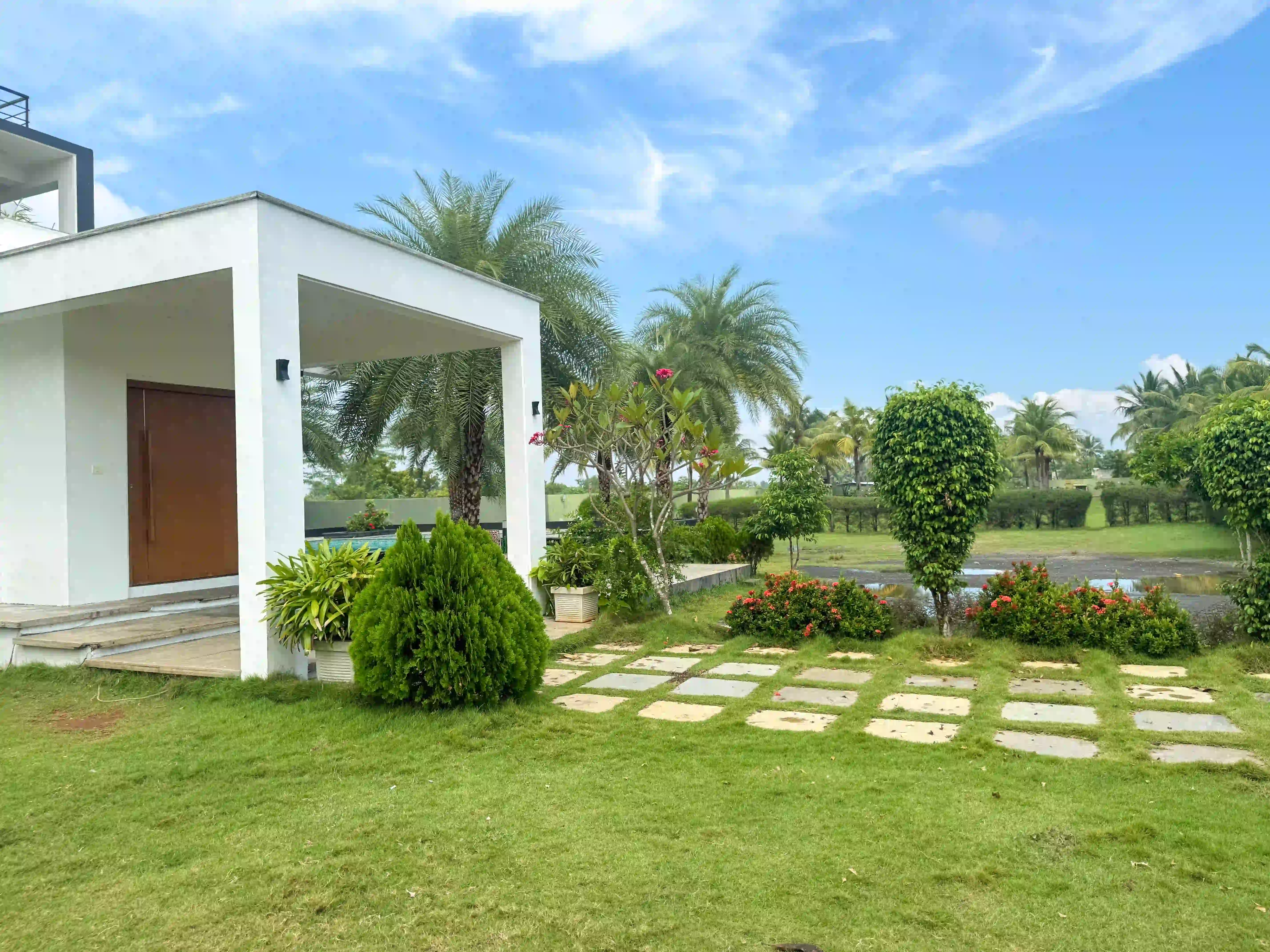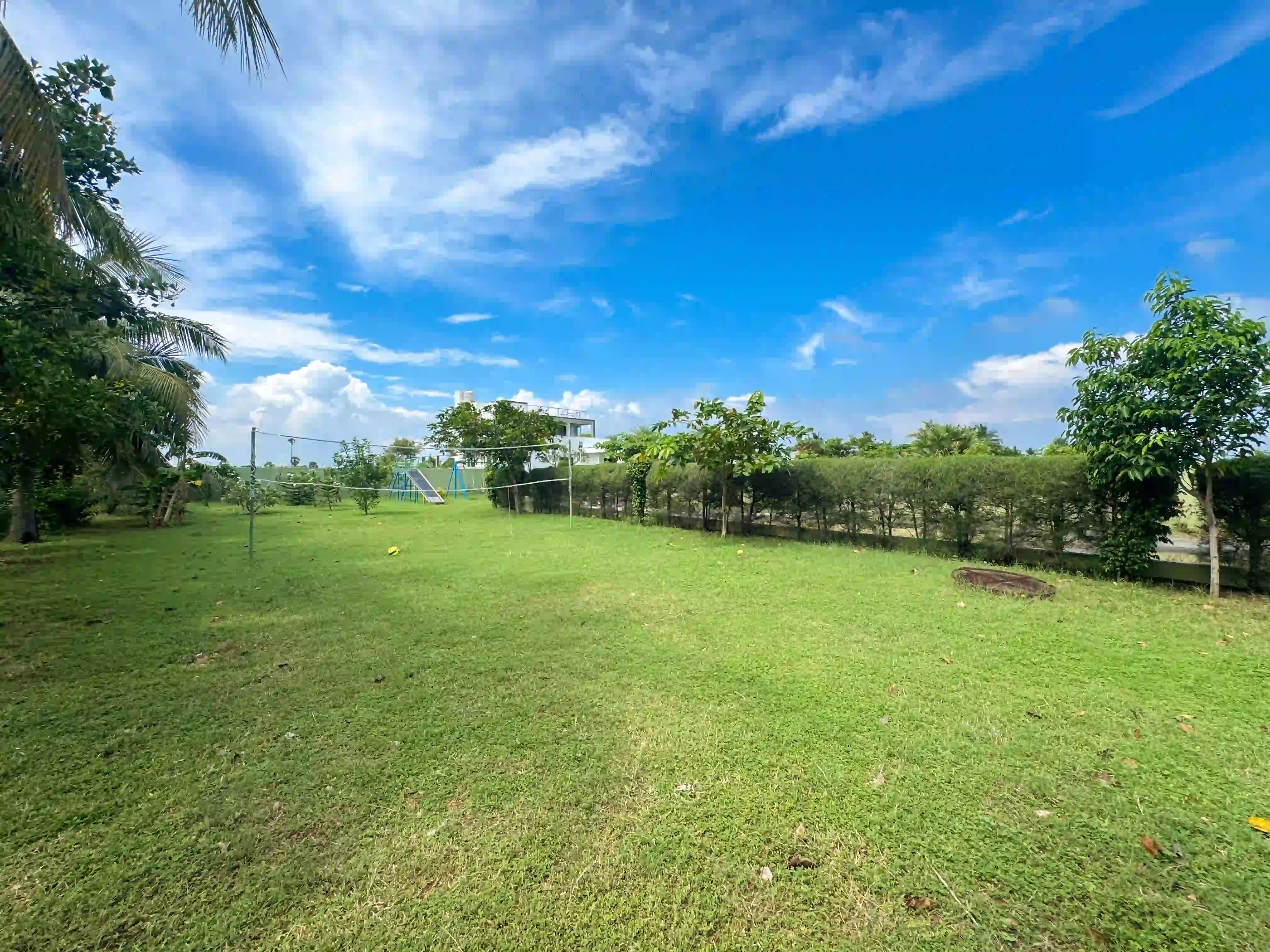 The Landmark Villa provides an exclusive space to go from the city lifestyle with privacy, comfort and sophisticated coastal living on the East Coast Road. Our one-acre 4BHK luxury beach villa blends the open green scenery with modern architectural design in Vadanemmeli, ECR. The smartly designed home with ground floor and first floor, with easy accessibility for the family and groups. Each Space promotes a tranquil living, with a vast lawn, ideal for intimate parties to large celebrations. Our modern interior design offers comfort and privacy. Our villa is surrounded by nature and a serene environment, which creates a balanced and sophisticated ambience. Whether it is a family retreat or a personal getaway, our villa provides privacy and style that integrates for memorable holidays.